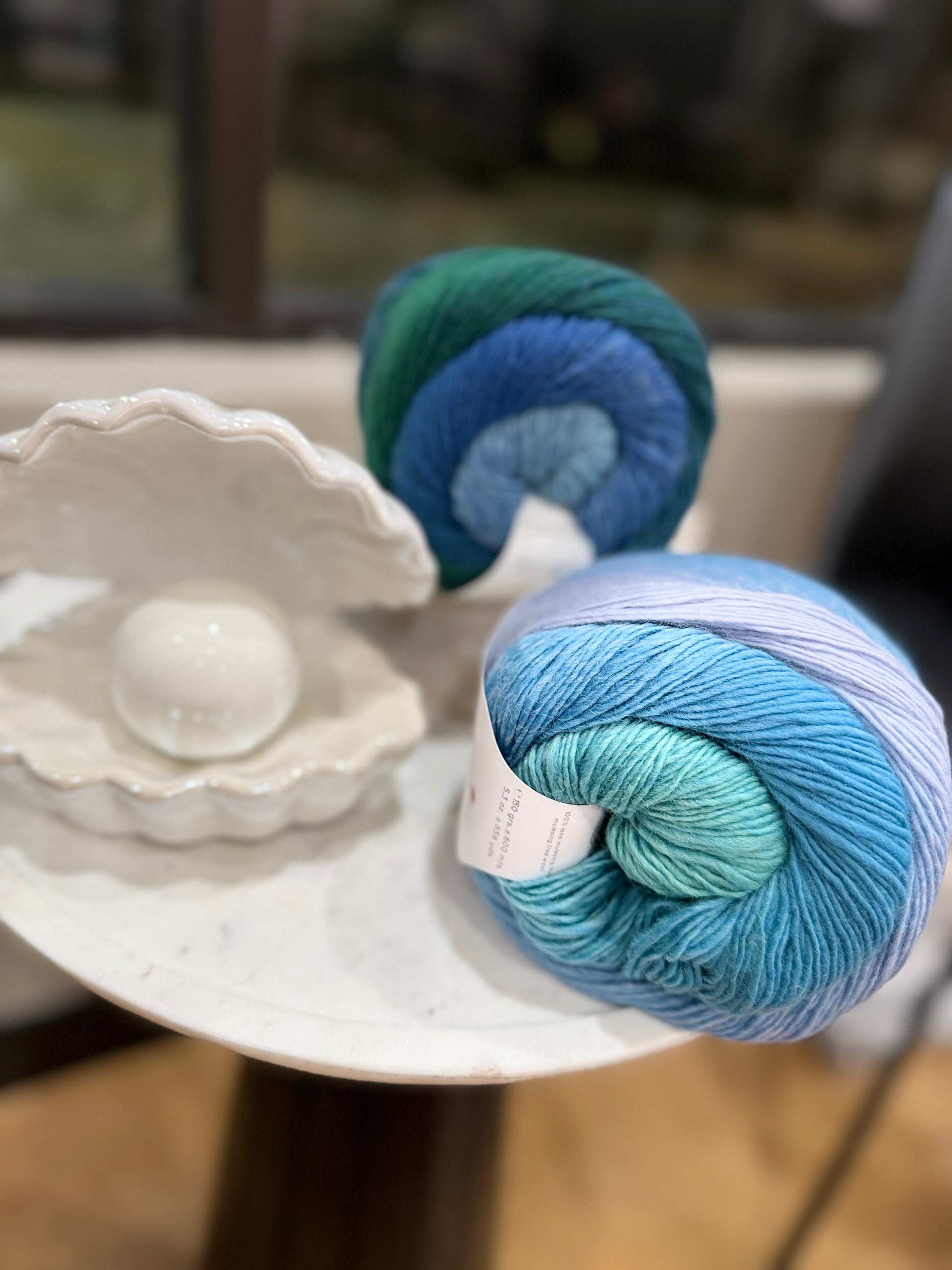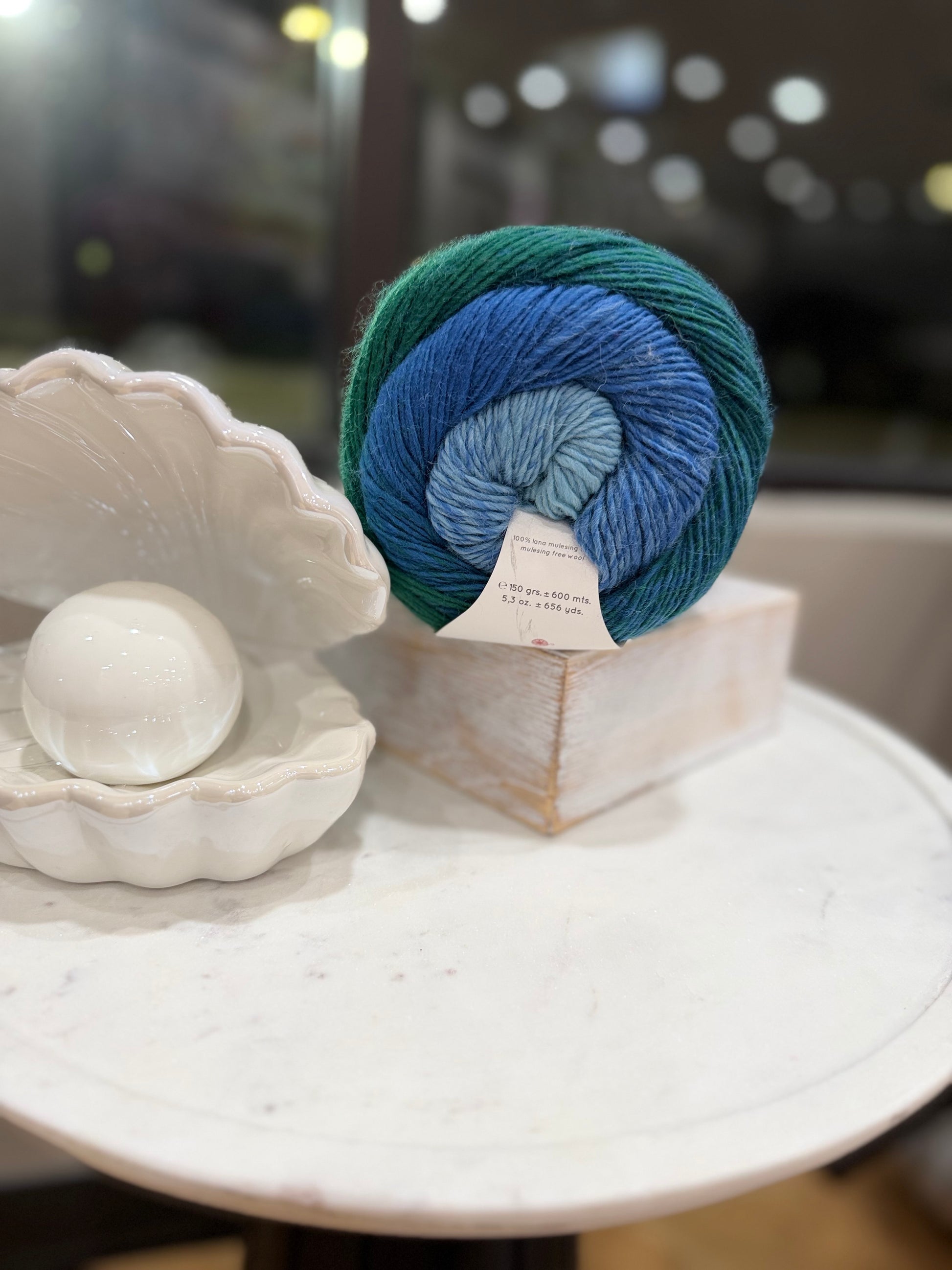 The multicolors of this 100% mulesing-free wool combine in a perfect sequence to produce a gradual degrade or ombre effect. The delicate shading makes it ideal for soft autumn and winter knitting. Using just one 656 yard ball, an entire shawl or oversized scarf can be created.
